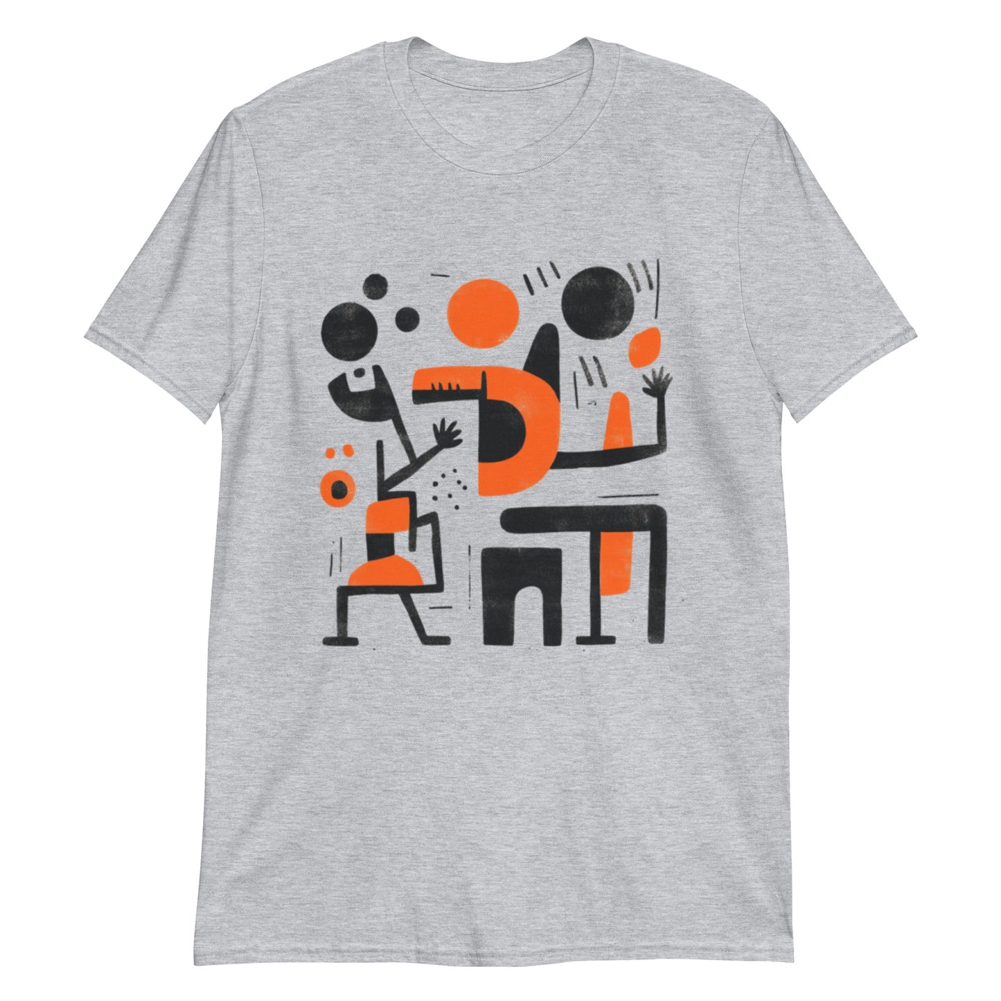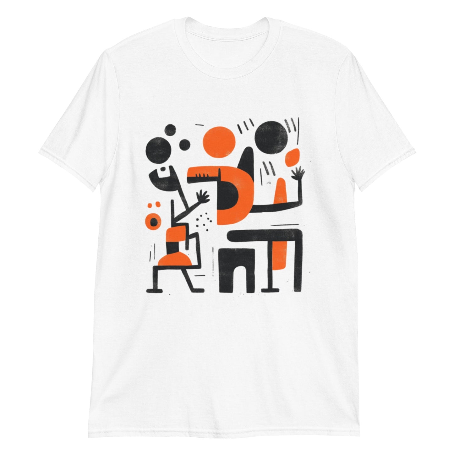 Das Design dieses T-Shirts besteht aus einer abstrakten Illustration mit geometrischen Figuren und kontrastierenden Farben, hauptsächlich Schwarz und Orange. Die Formen scheinen stilisierte menschliche Figuren in einer Szene darzustellen, die auf Interaktion oder Aktivität schließen lässt und ein Gefühl von Dynamik und Bewegung vermittelt. Diese Art von Design ist ideal für diejenigen, die ein modernes und künstlerisches Kleidungsstück suchen, das durch seine Originalität und seinen grafischen Stil auffällt.