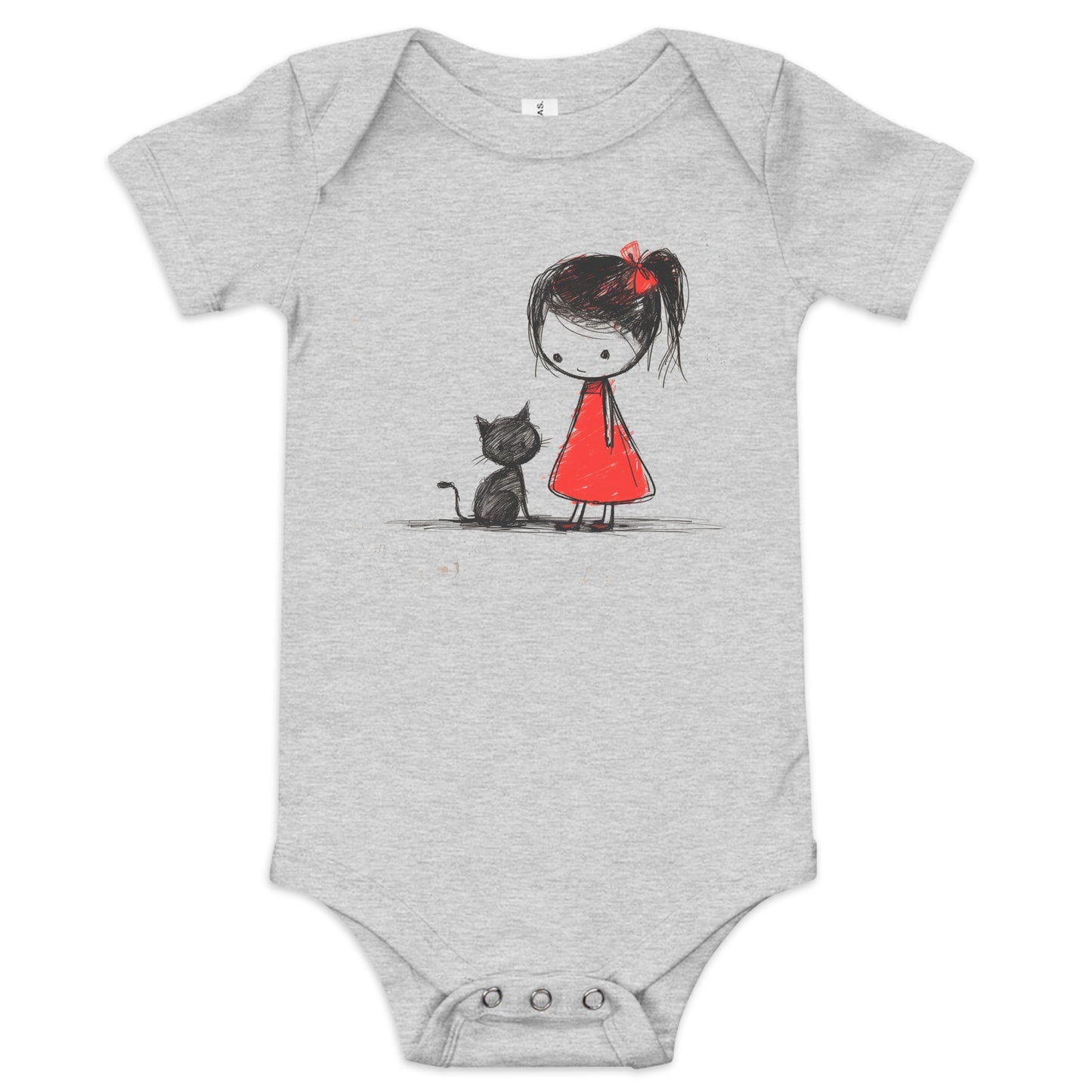 Dieser Baby-Body hat ein originelles und bezauberndes Design mit einem Mädchen und ihrer Katze im Freihand-Zeichnungsstil. Der Kontrast des roten Kleides sorgt für einen Hauch lebendiger und stilvoller Farbe. Dieser Body ist ideal für die Kleinen und kombiniert Komfort und ein bezauberndes Design, perfekt für jeden Anlass. Verleihen Sie der Garderobe Ihres Babys mit diesem einzigartigen und stilvollen Kleidungsstück einen Hauch von Süße und Originalität.